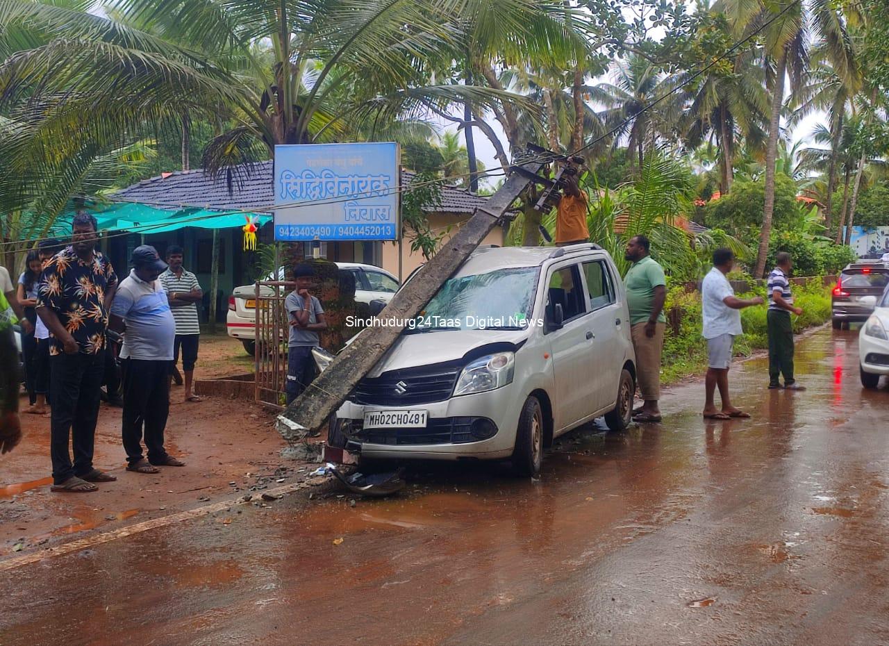 याबाबत मिळालेल्या माहितीनुसार मुंबईहून मालवणात पर्यटनासाठी आलेल्या पर्यटकांची वॅगनार कार आज सकाळी देवबाग येथून मालवणच्या दिशेने जात असताना तारकर्ली सुतारवाडी येथे साई मंदिर मार्गावर रस्त्याच्या कडेला असलेल्या सिमेंटच्या वीज खांबाला धडकली. कार रस्त्याच्या विरुद्ध बाजूला येऊन पोलाला धडकल्याने चालकाचे नियंत्रण सुटले असावे, अशी चर्चा होती. या जोरदार धडकेत वीज पोल मुळातून तुटून कारच्या दर्शनी भागावर कोसळला. यामुळे गाडीची पुढील काच फुटून दर्शनी भागाचे मोठे नुकसान झाले. या कारमधून प्रवास करणारे चार पर्यटक सुदैवाने बचावले. यावेळी स्थानिकांनी घटनास्थळी धाव घेत पर्यटकांना गाडीच्या बाहेर काढले.